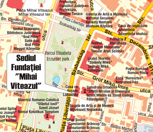 Fundaţia "Mihai Viteazul" Sfântu Gheorghe, jud. Covasna Adresa: str. Libertăţii, nr. 7, Sfântu Gheorghe, jud. Covasna, cod poştal 520008 E-mail fundaţie: fmvcov90@yahoo.com Preşedinte fundaţie: Maria Peligrad - e-mail: mpeligrad@yahoo.com Vicepreşedinte: Stela Buda - Tel: 0267/311736